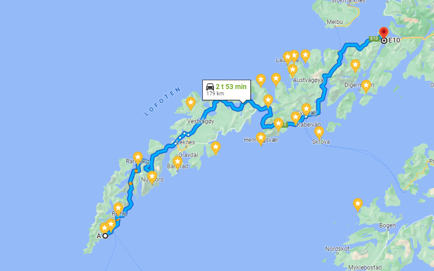 Etter Leknes passerer du de små bygdene Napp og Ramberg, og hvor neste anbefalte avstikker er til det lille historiske fiskeværet Nusfjord. Videre kommer du til de idylliske stedene Hamnøy og Reine før du rett etter dem er kommet helt ut til Å.