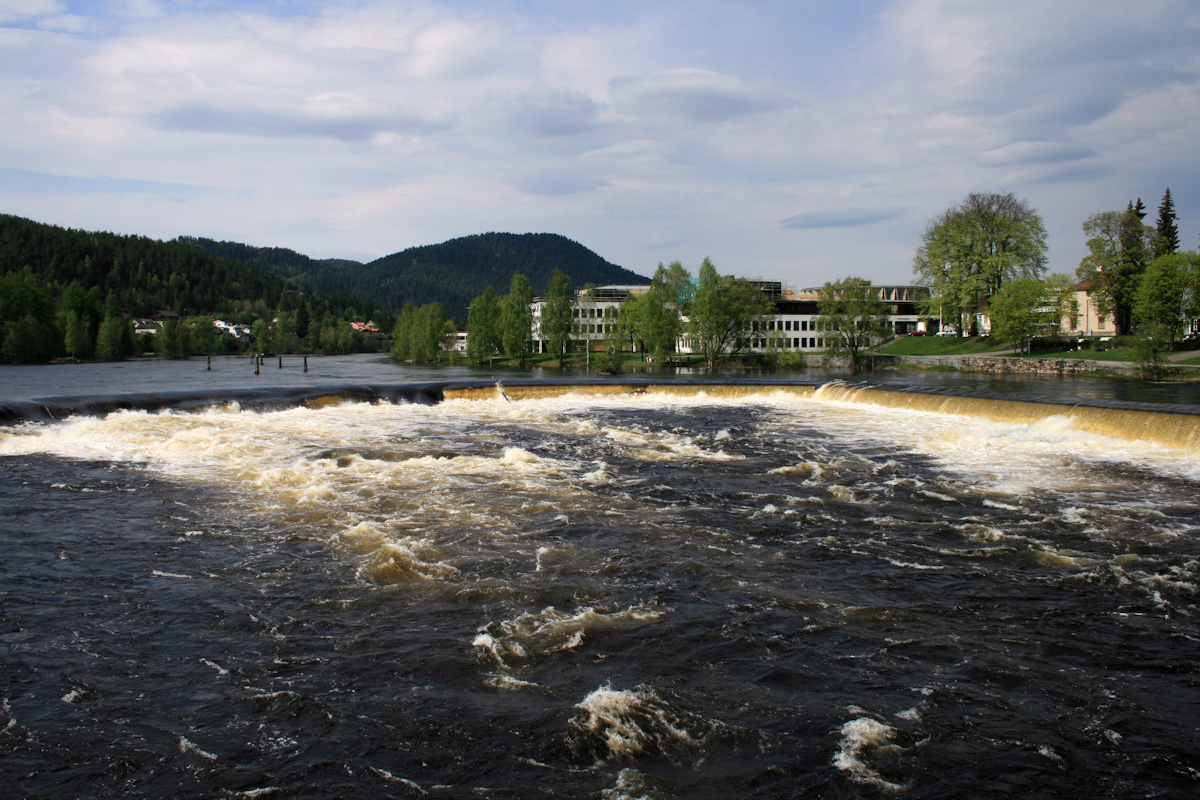 Elven Numedalslågen deler byen i to med den eldste delen på vestsiden av elven og Nybrufoss. Det går en flott bro over elven og fossen som forbinder begge bydelene, og drar du over broen fra vest kommer du rett inn i sentrum på østsiden.