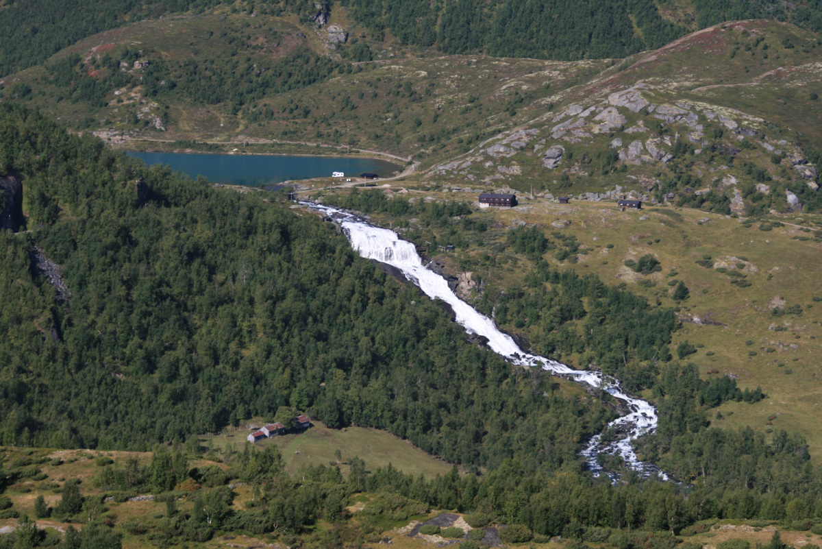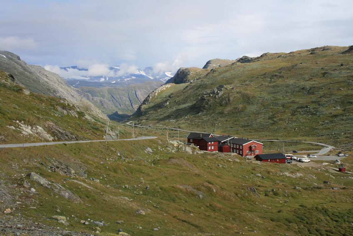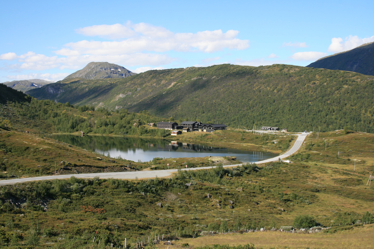 Bare 2,4 km etter Vegaskjeldet kommer du til Bøverkinnhalsen og ser mot Jotunheimen fjellstue. Herfra er det ikke så veldig langt før du kommer til Krossbu og enden av både Bøverdalen og elven Bøvre - bare 13,4 km. Men i mellomtiden vil du enda kjøre gjennom spektakulær og flott natur som du bare må nyte på turen. Men før du kjører videre kan du jo beskue den flotte Høyfossen som ligge vis a vis fjellstuen. Når du passerer fjellstuen vil du se mot Bøvertjønnene og imponerende flott natur.